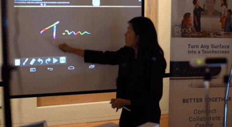 它可以瞬间把墙壁、桌面等任何不透明表面变成可触控的巨屏,用配套的触控笔就可以进行操作。